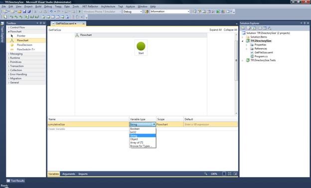 I added a Flowchart activity to the project and added a local variable called cumulativeSize. A pain-in-the-butt feature of WF is that long (and most other types) and not available in the select box.