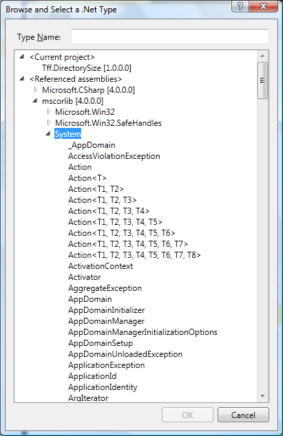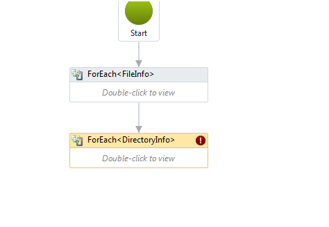 I need a way of representing an instantiated DirectoryInfo object in my WF using that input argument. I realized that I need to wrap the DirectoryInfo class with an activity to use it. I dropped in a code activity thinking that all I had to do was implement the IDirecotryInfo interface. Note that to avoid name collisions, I called the activity “DirectoryInfoActivity”, not “DirectoryInfo”.
