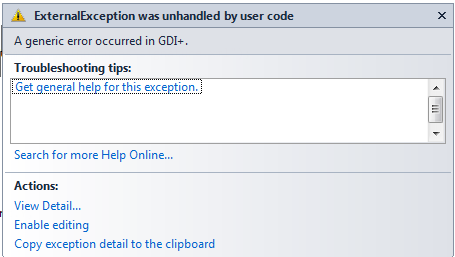 Carp! And no inner exception to boot! When you Bing/Google/AskJeeves this exception, you get TONS of potential reasons (Security, Location, OOM, etc…) – basically, the managed wrapper for the CGI+ call didn’t implement any exceptions. Without knowing anything about the implementation, I have to believe that HRESULT did return something, MSFT was just to lazy busy to send out meaningful exception message.