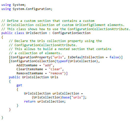 public UrlConfigElement(String name, String url) { this.Name = name; this.Url = url; } public UrlConfigElement() { this.Name = "Contoso"; this.Url = "http://www.contoso.com"; this.Port = 0; }