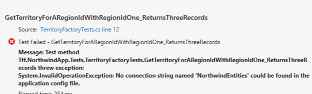 I needed to copy/paste the .config over. (Which is the 1st clue that my test is is actually an integration test). I then ran the test and got red: