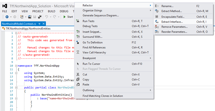 This is the problem I solved at the code camp 2 years ago (Note that this would be so much easier if MSFT added interfaces to their auto generated classes. Just sayin’). In any event, the way around it is to use a partial class and then extract the interface from that partial class. To that end, I added a new class to the project with the following code: