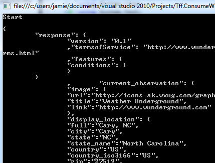 Now that I have a source of data, I need a way to consume the data using Visual Studio.  I fired up a Console project just to see how difficult it would be to consume.  I put in a typical webrequest/response: