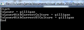 My first stop was the String.ToLower() overload.  I pumped in the different cultures (Current and CurrentUI):