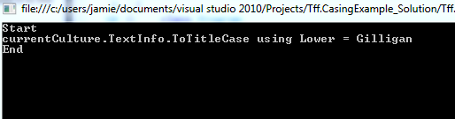 Console.WriteLine(String.Format("currentCulture.TextInfo.ToTitleCase using Lower = {0}",