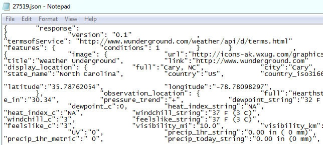 Following the Weather API for Developers – JSON link, I signed up for a free developer account.  Within minutes I got my API key and I was ready to start looking for the data I was interested in for my application. I first went to the documentation page, I started with the current conditions for a city example: