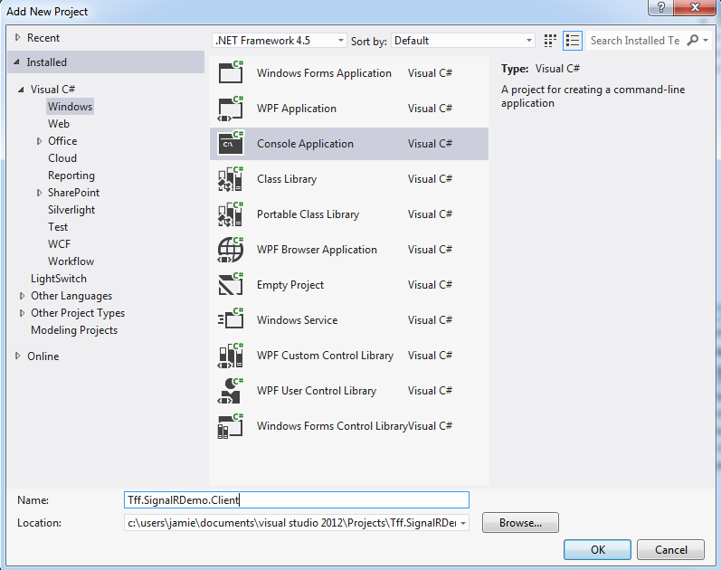Step #7: Go to the Client project and open the NuGet Package Manager Console and install the SignalR Client package. Important, make sure that the default project is pointed to the client project