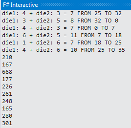 - printfn "die1: %A + die2: %A = %A FROM %A TO %A"