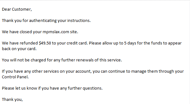 I contrast this experience with another one I had this week with WinHost. I was running a site for a local group when the renewal came up. The group was done so the site was coming down – I put it on my life’s //TODO list to cancel the site. By the time I got to it – the site had renewed and the card had been charged. I immediately emailed their support and within 20 minutes, I had this in my inbox: