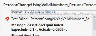 With that done, I looked at the last PercentChange calculation. The only thing remarkable about it is that the code in the on-line tutorial is incorrect. The tutorial uses Price as the denominator, but my unit tests shows that it wrong: