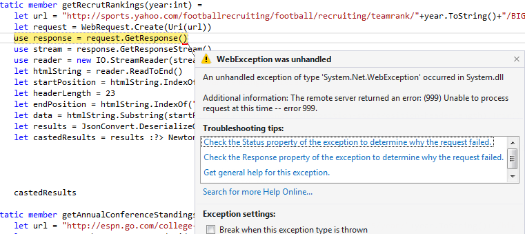 Following up on my last post about screen scraping college football in F#, I took the next step and analyzed the data that I scraped. I am a big believer in Domain Specific Language so ‘Rankings’ means the ranking assigned by Rivals about how well a school recruits players. ‘Standings’ means the final position in the Big Ten after the games have been played. Ranking is for recruiting and standings is for actually playing the games.