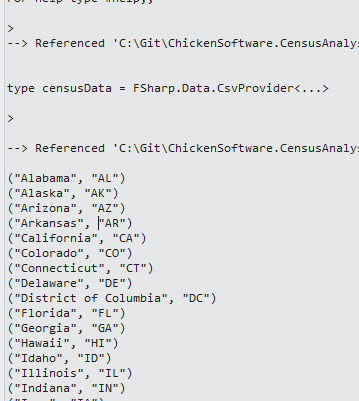 let arkansasData = censusDataContext.Load("https://portalvhdspgzl51prtcpfj.blob.core.windows.net/censuschicken/AK.TXT"); arkansasData.Rows |> Seq.iter(fun r -> printfn "%A" r)