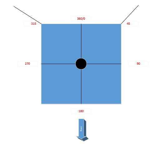 First, we tackled the pan (X coordinate) of the missile launcher. The launcher is a on a square base and the full range of the launcher is 45 degrees to 315 degrees.