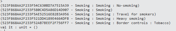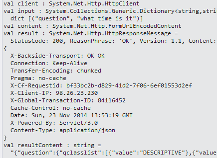 1 let client = new HttpClient() 2 client.DefaultRequestHeaders.Authorization <- new AuthenticationHeaderValue("Basic",authKey) 3 4 let input = new Dictionary<string,string>() 5 input.Add("question","How can I quit smoking") 6 let content = new FormUrlEncodedContent(input) 7 8 let result = client.PostAsync(baseUrl,content).Result 9 let resultContent = result.Content.ReadAsStringAsync().Result 10 11 type qaResponse = JsonProvider<".\QAResponseJson.json"> 12 let qaAnswer = qaResponse.Parse(resultContent) 13 14 qaAnswer.Question.Answers 15 |> Seq.ofArray 16 |> Seq.iter(fun a -> printfn "(%s)" a.Text)
