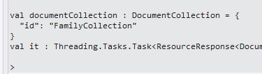 1 let documentCollection = new DocumentCollection() 2 documentCollection.Id <- "FamilyCollection" 3 client.CreateDocumentCollectionAsync(database.CollectionsLink,documentCollection,requestOptions) 4