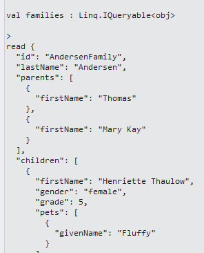1 type Parent = {firstName:string} 2 type Pet = {givenName:string} 3 type Child = {firstName:string; gender:string; grade: int; pets:Pet list} 4 type Address = {state:string; county:string; city:string} 5 type family = {id:string; lastName:string; parents: Parent list; children: Child list; address: Address; isRegistered:bool} 6 7 let andersenFamily = {id="AndersenFamily"; lastName="Andersen"; 8 parents=[{firstName="Thomas"};{firstName="Mary Kay"}]; 9 children=[{firstName="Henriette Thaulow";gender="female"; 10 grade=5;pets=[{givenName="Fluffy"}]}]; 11 address={state = "WA"; county = "King"; city = "Seattle"}; 12 isRegistered = true} 13 14 client.CreateDocumentAsync(documentCollection'.Resource.DocumentsLink, andersenFamily) 15