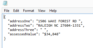 As a follow up to this post, I then turned my attention to parsing the Wake County Public School Assignment Site. If you are not familiar, large schools districts in America have a concept of ‘nodes’ where a child is assigned to a school pyramid (elementary, middle, high schools) based on their home address. This gives the school attendance tremendous power because a house’s value is directly tied to how “good” (real or perceived) their assigned school pyramid. WCPSS has a site here where you can enter in your address and find out the school pyramid.