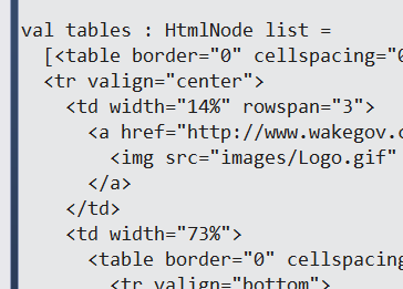 8 let schoolRows = schoolTable.Descendants("TR") |> Seq.toList