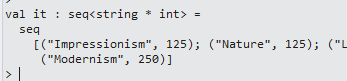 1 let tagSet = artShow.paintings |> Seq.map(fun p -> p.tags) 2 |> Seq.collect(fun t -> t.Split(';')) 3 |> Seq.groupBy(fun t -> t) 4 |> Seq.map(fun (id,t) -> id, t |> Seq.length) 5