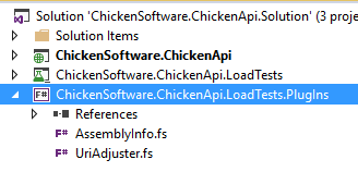 Enter web test plug ins. I added a F# project to the solution and added a .fs file called UriAdjuster like so: