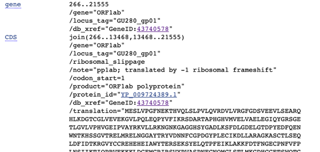 One of the cool things about viruses is that because their genome is so small, they can generate multiple genes out of the same base sequence.  They do this with a technique called “frameshifting” where the bases are read in groups of three (a codon) from different start locations – effectively using the same base pair in either the first, second, or their position of a codon.  I believe that the ORF1ab gene is read with a frameshift of -1, so the F# would be: