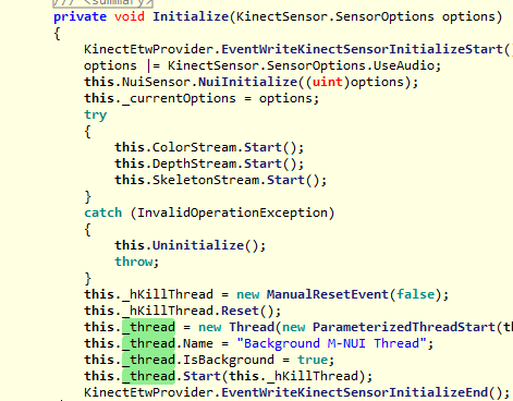 1 member this.kinectSensor_ColorFrameReady(args: ColorImageFrameReadyEventArgs) = 2 use colorFrame = args.OpenColorImageFrame() 3 if not (colorFrame = null) then 4 let colorData = Array.zeroCreate<byte> colorFrame.PixelDataLength 5 colorFrame.CopyPixelDataTo(colorData) 6 let width = colorFrame.Width 7 let height = colorFrame.Height 8 let stride = colorFrame.Width * colorFrame.BytesPerPixel 9 let eventArgs = new ColorDataReadyEventArgs(colorData,width,height,stride) 10 colorDataReady.Trigger(eventArgs) 11 () 12 13 member this.KinectSensor_SkeletonFrameReady(args: SkeletonFrameReadyEventArgs) = 14 use skeletonFrame = args.OpenSkeletonFrame() 15 if not (skeletonFrame = null) then 16 let skeletons = Array.zeroCreate<Skeleton> skeletonFrame.SkeletonArrayLength 17 skeletonFrame.CopySkeletonDataTo(skeletons) 18 let skeletons1 = skeletons |> Array.filter (fun s -> s.TrackingState = SkeletonTrackingState.Tracked) 19 if skeletons1.Length > 0 then 20 skeletonChanged.Trigger(skeletons1.[0]) 21 () 22 () 23 24 member this.initializeKinect() = 25 _kinectSensor.ColorStream.Enable() 26 _kinectSensor.ColorFrameReady.Subscribe(this.kinectSensor_ColorFrameReady) |> ignore 27 _kinectSensor.SkeletonStream.Enable(); 28 _kinectSensor.SkeletonFrameReady.Subscribe(this.KinectSensor_SkeletonFrameReady) |> ignore 29 _kinectSensor.Start() 30