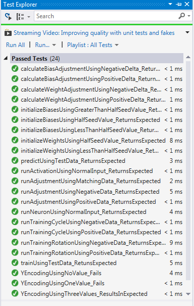 [TestMethod] public void runNeuronUsingNormalInput_ReturnsExpected() { var expected = -0.0219; var perceptronOutput = _perceptron.runNeuron(_neuronInput); var actual = Math.Round(perceptronOutput, 4); Assert.AreEqual(expected, actual); } [TestMethod] public void runActivationUsingNormalInput_ReturnsExpected() { var expected = -1; var actual = _perceptron.runActivation(-0.0219); Assert.AreEqual(expected, actual); }