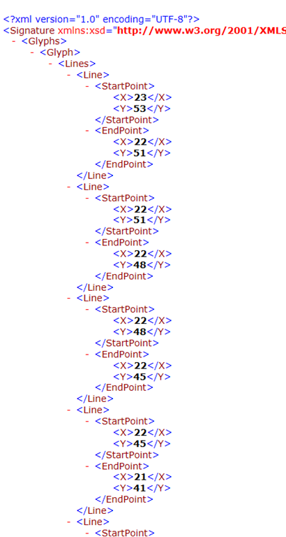 The problem is that this file is larger than a image file – but much more analyzable (and yes, that is a real word). I then wanted to display the signature in a web browser. To that end, I fired up a classic ASP.NET application and created a web control. In the code, I rendered the points out of the XML file back into a graphic: