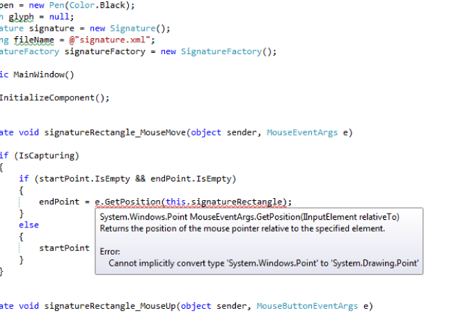The once thing I don’t like is that the word ’signature’ is in both the namespace and is a class name – so I get conflicts. I am not sure what I want to rename the class so I left it ‘as is’ right now. But as Bob Martin says “with these modern/fancy IDEs, renaming a class should take no time at all.”