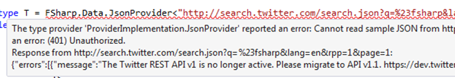 So without an out of the box API to use, I thought about using a Json Type Provider the way Lincoln Atkinson did. The problem is that is example is for V1 of Twitter and V 1.1 uses Oauth. If you run his code, you get