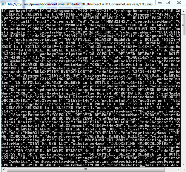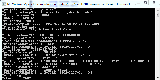 Aetna is dipping its toe into public facing APIs via Carepass.  I signed up for a license and wanted to see how easy it was to consume some HHS drug data found here.  I first checked a GET inside a browser with the following uri: