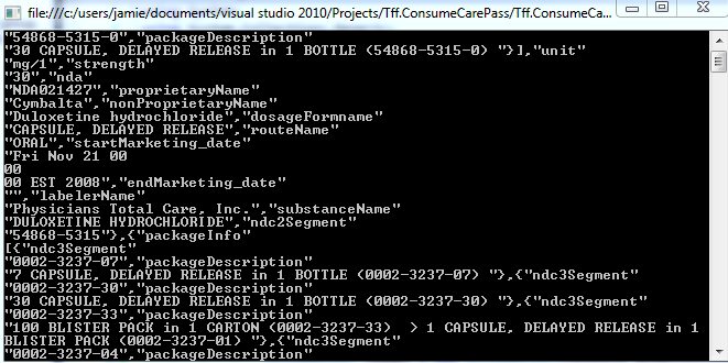 Now that I have a source of data, I need a way to consume the data using Visual Studio.  I fired up a Console project just to see how difficult it would be to consume.  I put in a typical webrequest/response: